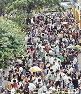 七月十四日,離中銀香港發(fā)行面額二十元港幣的奧運紀(jì)念鈔票還有兩天時間,香港中銀大廈外已有不少市民排隊等候。 中新社發(fā) 武仲林 攝