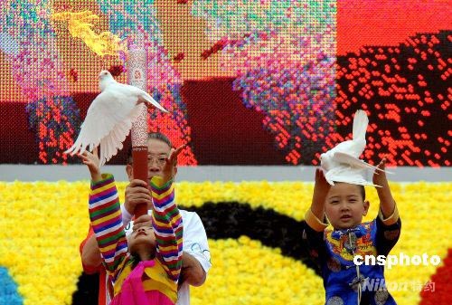 7月15日,奧運火炬在吉林松原傳遞,少數(shù)民族兒童在火炬手起跑前放飛白鴿。中新社發(fā) 廖攀 攝