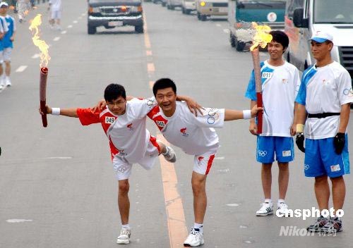 7月15日,奧運(yùn)火炬開(kāi)始在吉林松原傳遞,火炬手徐建、成聰在傳遞中擺出飛翔造型。中新社發(fā) 廖攀 攝