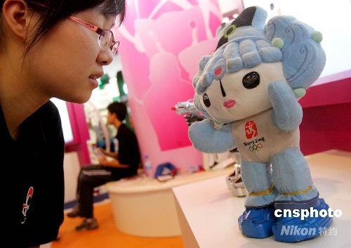 7月15日,在上?萍拣^舉行的2008上海國際青少年科技博覽會上,一款娛樂型語音控制機器人“福娃”亮相,吸引不少好奇的目光。據(jù)介紹,該款福娃機器人不僅能與人對話,還能回答與奧運會相關的問題。中新社發(fā) 湯彥俊 攝