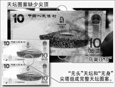 昨天,記者在中國人民銀行官方網(wǎng)站和新華社等全國媒體公布的奧運(yùn)紀(jì)念鈔照片中看到,所有紀(jì)念鈔正面的圖案一模一樣,均出現(xiàn)“鳥巢壓頂”情況。將兩張紀(jì)念鈔上下相接,“無頭”天壇和“無身”尖頂恰好可以組成一個(gè)完整的天壇圖案。