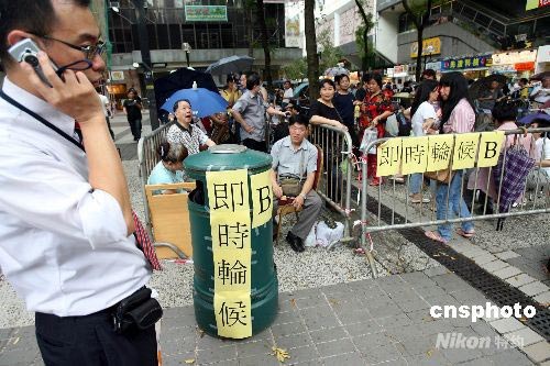 中銀香港發(fā)行奧運(yùn)紀(jì)念鈔掀起全城狂熱。連日來(lái)數(shù)千計(jì)市民冒“黃色暴雨”排隊(duì)輪候,發(fā)售奧運(yùn)紀(jì)念鈔票的各分行滿是擁擠的人龍。七月十五日下午,中銀香港尖沙咀分行向通宵排隊(duì)的市民作登記。 中新社發(fā) 洪少葵 攝