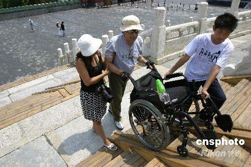 2008年7月15日,一位有腿疾的外國游客在他人的幫助下登上無障礙臺(tái)階。為迎接奧運(yùn)會(huì)及殘奧會(huì),方便殘疾游客,北京天壇公園首次在祈年殿東側(cè)臺(tái)階搭建無障礙設(shè)施,搭建工作于近日完成。中新社發(fā) 魯谷 攝