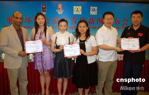 7月15日,在舉世矚目的北京奧運會即將開幕之際,由11位中國奧運冠軍傾情出演的“奧運環(huán)保公益廣告片”在北京舉行首映式。由中國環(huán)境意識項目出資拍攝的這部公益廣告片,不僅受到了北京奧組委的鼎力支持,而且得到了王軍霞、鄧亞萍、樓云、高敏、樂靖宜、楊揚、楊凌、羅雪娟、桑雪和李永波等奧運冠軍和著名教練的熱烈響應(yīng)。圖為羅雪娟(左二)、桑雪(左三)和楊凌(右一)代表其他冠軍接受公益廣告拍攝紀(jì)念證書。中新社發(fā) 潘旭臨 攝