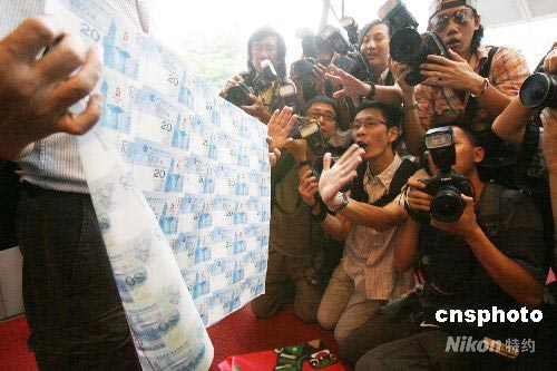 七月十六日,奧運(yùn)紀(jì)念鈔票在香港火爆開(kāi)售,眾多市民通宵在中銀香港總行外輪候。圖為買(mǎi)到紀(jì)念鈔的市民向媒體展示。 中新社發(fā) 武仲林 攝