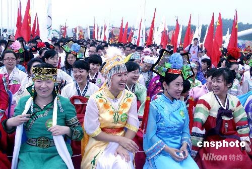 7月17日,北京奧運(yùn)火炬在沈陽傳遞,當(dāng)?shù)厣贁?shù)民族群眾喜迎奧運(yùn)火炬。中新社發(fā) 周兆軍 攝