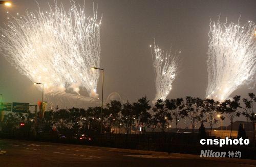 7月16日晚,北京奧運會開幕式彩排首次燃放禮花,鳥巢上空絢爛多彩。中新社發(fā) 吳芒子 攝