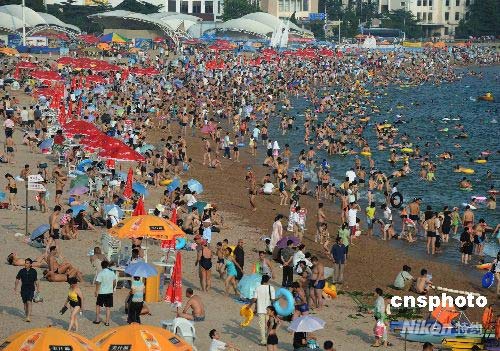 青島第一海水浴場(chǎng)游泳的游人爆滿。經(jīng)過一個(gè)多月的全力奮戰(zhàn),困擾2008北京奧運(yùn)會(huì)帆船賽舉辦地青島的近海滸苔已得到了有效的清除和遏制,奧帆賽訓(xùn)練比賽場(chǎng)地和海水浴場(chǎng)又恢復(fù)了往日的熱鬧景象。中新社發(fā) 曲連遵 攝