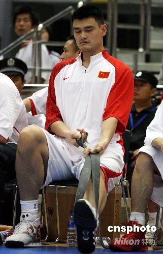 圖為姚明在比賽間訓(xùn)練負傷的左腳。中新社發(fā) 任晨鳴 攝