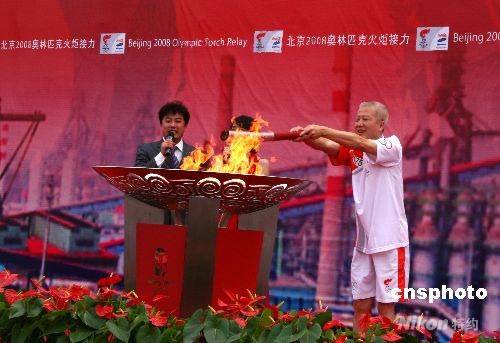 7月18日上午,北京奧運(yùn)火炬圓滿結(jié)束了在“鋼城”遼寧鞍山的傳遞。圖為最后一棒火炬手聞寶滿點(diǎn)燃圣火盆。 中新社發(fā) 周兆軍 攝