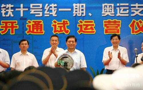 7月19日,北京地鐵10號線(一期)、奧運(yùn)支線、機(jī)場線開通試運(yùn)營儀式在地鐵10號線與奧運(yùn)支線交匯的北土城站舉行。中共中央政治局委員、北京市委書記、北京奧組委主席劉淇啟動(dòng)三條地鐵線路。 中新社發(fā) 富田 攝