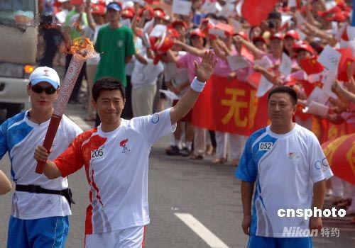 7月21日,奧運(yùn)火炬在山東青島傳遞,影星夏雨擔(dān)任火炬手傳遞火炬。 中新社發(fā) 廖攀 攝