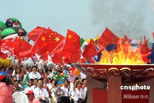 圖:奧運(yùn)圣火在青島海濱熊熊燃燒