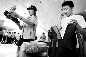 昨天10時(shí)許,記者先來到北京西站進(jìn)站口,比以往更加嚴(yán)格的是,這里除了對(duì)每件行李進(jìn)行機(jī)檢外,民警還輔助用手持液體查危儀對(duì)行李中的液體進(jìn)行檢查,現(xiàn)場(chǎng)鐵警告訴記者:“如果發(fā)現(xiàn)行李中攜帶了液體,我們將會(huì)要求旅客將液體拿出,并用儀器進(jìn)一步檢測(cè)液體安全!甭每褪掷锬弥钠垦b水,開蓋的則要求當(dāng)場(chǎng)喝一口,沒有開蓋的則也要過液體安檢儀。