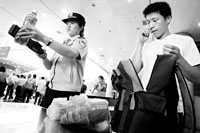 昨天10時許,記者先來到北京西站進(jìn)站口,比以往更加嚴(yán)格的是,這里除了對每件行李進(jìn)行機檢外,民警還輔助用手持液體查危儀對行李中的液體進(jìn)行檢查,現(xiàn)場鐵警告訴記者:“如果發(fā)現(xiàn)行李中攜帶了液體,我們將會要求旅客將液體拿出,并用儀器進(jìn)一步檢測液體安全!甭每褪掷锬弥钠垦b水,開蓋的則要求當(dāng)場喝一口,沒有開蓋的則也要過液體安檢儀。