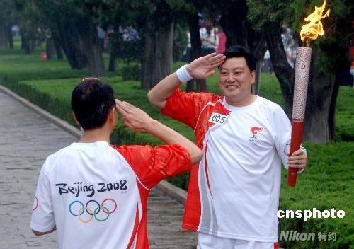 7月22日上午,奧運(yùn)火炬在山東曲阜傳遞,兩位火炬手交接時(shí)互敬軍禮。 中新社發(fā) 廖攀 攝