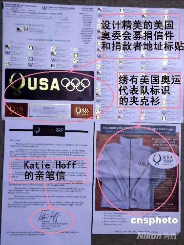 7月22日,記者收到的一封募捐信說:你只需捐20美元,就可以獲得一件如圖所示的繡著美國奧運代表隊標(biāo)記的運動夾克。更重要的是,這意味著你支持了美國奧運代表隊前往北京參賽的路費。信中還附有美國游泳女一號種子選手霍芙的親筆募捐信。圖為來自美國奧委會的募捐信件內(nèi)容。 中新社發(fā) 邱江波 攝