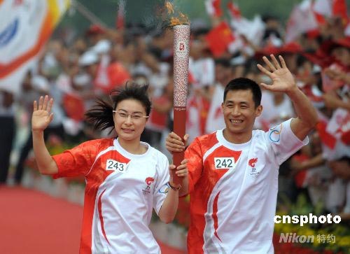 7月23日,奧運(yùn)火炬在山東濟(jì)南傳遞,中國跳水隊(duì)運(yùn)動員、世界冠軍郭晶晶、王峰共同傳遞濟(jì)南最后一棒火炬。 中新社發(fā) 廖攀 攝