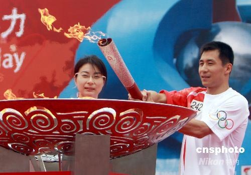 奧運火炬在山東濟(jì)南傳遞,中國跳水隊現(xiàn)役運動員郭晶晶、王峰共同傳遞濟(jì)南最后一棒火炬并點燃圣火盆。中新社發(fā) 廖攀 攝