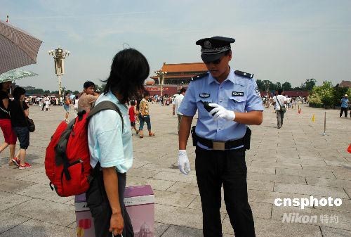 近日,奧運臨近,天安門廣場民警對游客攜帶物品檢查越來越嚴格。圖為巡邏的民警正在盤查游客包裹,以保障奧運會順利進行。中新社發(fā) 張雙雙 攝