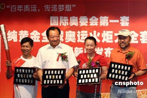 7月23日,奧運火炬手許海峰(左二)、王勇峰(右一)、金晶(右二)和劉超英(左一)展示奧運火炬大全套藏品。當(dāng)天,由國際奧委會和北京奧組委授權(quán)發(fā)行的“純黃金全球奧運火炬大全套”紀(jì)念條藏品在北京面世。該藏品收集了奧運會開辦至今的共17支火炬,正面火炬由浮雕工藝制作而成,背面為該屆奧運會會徽和奧林匹克五環(huán)標(biāo)志。中新社發(fā) 盛佳鵬 攝