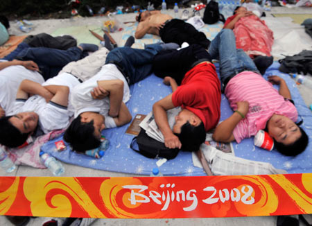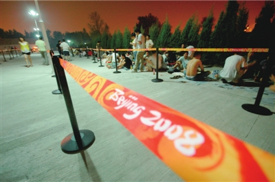 從昨天下午1點開始,已有人趕到朝陽區(qū)北土城東路奧體中心售票處等待購買25日才開售的最后一批奧運門票。至昨晚11點,已有300余人趕到排隊,且隊伍仍在不斷擴(kuò)大。