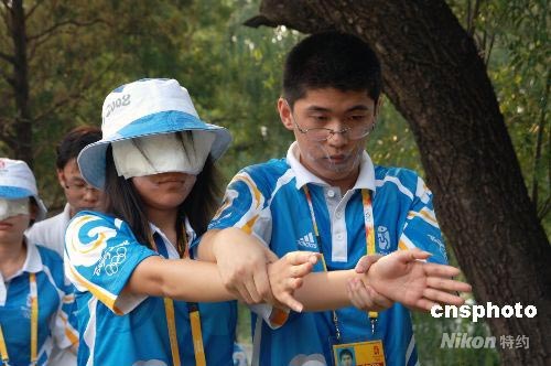 7月23日,北京2008奧林匹克青年?duì)I里的志愿者正在進(jìn)行信任度培訓(xùn)。該培訓(xùn)由兩個(gè)人進(jìn)行配合,一個(gè)人把眼睛蒙住、一個(gè)人把嘴巴封住,完全靠對(duì)方的身體語(yǔ)言進(jìn)行溝通,該培訓(xùn)將有助于志愿者對(duì)奧林匹克青年?duì)I里首次招募的殘疾人營(yíng)員進(jìn)行幫助。 中新社發(fā) 王東明 攝