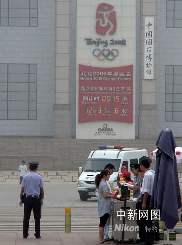天安門廣場東部的奧運(yùn)會倒計時牌前保安依然嚴(yán)謹(jǐn)。作者:賈國榮