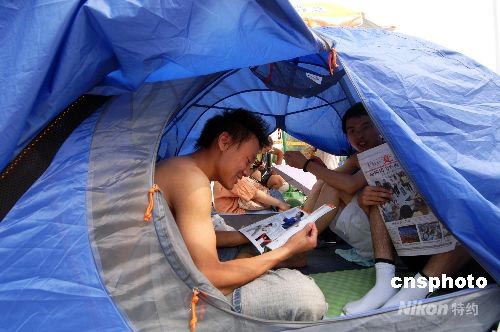 7月24日下午,北京的大學生搭著帳篷冒酷暑等待購買最后一批奧運門票。奧運第四階段門票銷售即將于25日正式開始,24日一大早就有大批民眾前往等候買票。中新社發(fā) 王東明 攝