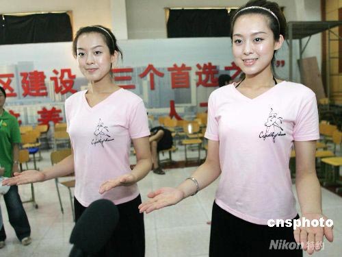 7月24日,中外記者前往北京昌平職業(yè)學(xué)校探營(yíng),19歲雙胞胎姐妹花李子曄、李曉曄,在眾多頒獎(jiǎng)禮儀志愿者中分外搶眼。自2008年7月12日,337名身材修長(zhǎng)、面容嬌美的頒獎(jiǎng)儀式專(zhuān)業(yè)志愿者開(kāi)始北京奧運(yùn)會(huì)頒獎(jiǎng)禮儀工作的沖刺培訓(xùn)。較之以往,此次培訓(xùn)除了頒獎(jiǎng)禮儀動(dòng)作、形體訓(xùn)練,特別增加了奧運(yùn)安保、拓展運(yùn)動(dòng)和藝術(shù)觀(guān)摩等課程。本月26日,這批志愿者將到各個(gè)場(chǎng)館進(jìn)入賽前實(shí)地訓(xùn)練。 中新社發(fā) 杜燕 攝