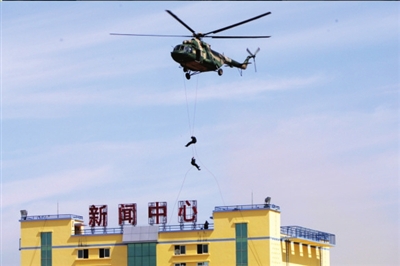 在指揮員下達(dá)攻擊令的余音中,空中垂降的特戰(zhàn)隊(duì)員從天窗潛入“歹徒”所在的樓層,乘坐攀登突擊車的兩組隊(duì)員左右破窗,與空中垂降的戰(zhàn)友同時(shí)攻入大廳,“歹徒”未及反抗,就被一一擊斃或制服。
