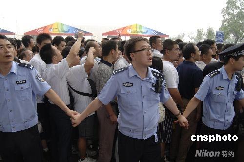 7月25日上午9時(shí),第4階段奧運(yùn)門(mén)票銷(xiāo)售正式開(kāi)始,近百名奧運(yùn)安保人員在北京五棵松籃球體育館外現(xiàn)場(chǎng)指揮數(shù)千球迷有序購(gòu)票。中新社發(fā) 徐曦弋 攝