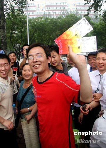 7月25日,北京奧運(yùn)會籃球比賽門票開始在五棵松籃球館發(fā)售,北京的何先生排了60個小時的隊,成為第一位購得比賽門票的幸運(yùn)者。 中新社發(fā) 甄雪原 攝
