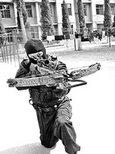 自述:我的外形很傳統(tǒng),乍一看,有些古代暗器的感覺。但我的威力卻不是其他普通弓箭所能比擬的。有了高科技的幫助,我的射程大大提高。“百步穿楊”是古代高手的絕技。但如今,有了紅外線瞄準器的幫助,任何反恐突擊隊員在使用我時,都可以百發(fā)百中。而強力弩弓的穿透力甚至能將15厘米厚的樹木一擊即穿。