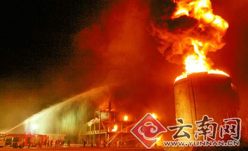 現(xiàn)場指揮部立即調動昆明、普洱、保山、西雙版納、麗江5地特勤部隊5輛戰(zhàn)斗車31名特勤隊員,對化工廠職工宿舍火災進行撲救。伴隨著呼嘯的警笛聲,消防照明車豎起照明燈,將起火的職工宿舍照的如同白晝。