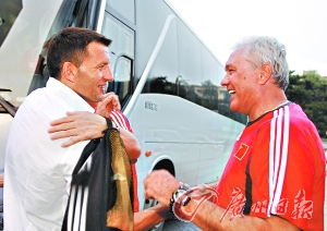 剛剛從比利時(shí)刺探完軍情返回國內(nèi)的杜伊前晚也已趕到長春和國奧大部隊(duì)會(huì)合。作為東道主,杜伊和另兩名塞籍助理教練托米奇、米西奇一早就在酒店的大堂等待同胞的抵達(dá)。當(dāng)塞隊(duì)大巴駛抵酒店門外,杜伊三人親切地迎了上去,和塞隊(duì)的官員、教練和球員逐一握手歡迎。
