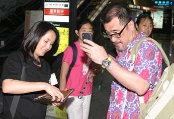 高金素梅率團體前往北京參加北京奧運表演彩排,在機場巧遇唱片制作人李宗盛(右),兩人互動熱絡(luò),相約北京見。 “中央社”圖
