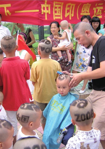 昨天,吳大勝(右一)正在一名小朋友頭上“創(chuàng)作”。北京市民吳大勝這幾天忙著免費(fèi)為小區(qū)的孩子理“奧運(yùn)頭”,以迎接第29屆奧運(yùn)會。他在孩子們的頭上理出多種圖案,受到歡迎。