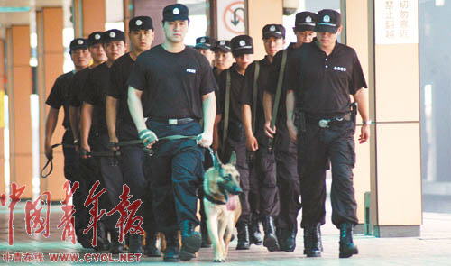 奧運會即將舉辦,突發(fā)事件隨時可能發(fā)生。為此,上海鐵路警方調(diào)集鐵警精銳進駐上海站,并成立了鐵路上海站奧運安保前線指揮部。7月以來,鐵路特警全副武裝攜警犬在上海站、車站廣場及與地方接合部晝夜進行巡邏檢查。