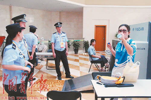 由于目前上海體育場實施全封閉管理,必須憑有效證件才能進入封閉區(qū)域,記者佩戴著奧運會注冊記者證進入上海體育場。在工作人員的安檢通道:首先,要在專門的驗證機器上檢查證件的真實性;接著,從兩根黑色柱子中間穿過,而這兩根很不起眼的黑色柱子卻是非常厲害的核生化檢測儀器,任何一點放射性物質(zhì)都可以檢測出來;隨后,就會通過和機場相同的安檢門,如果身上攜帶了金屬物品,儀器就會發(fā)出警報,工作人員就會手持安全檢查儀進行進一步檢查,而行李則須從X光物品檢查儀通過。而更嚴(yán)格的是,進入奧運場所的人員攜帶的手機、手提電腦都必須進行開機測試,攜帶的飲料則必須開瓶試飲一口,至于打火機則不得帶入。