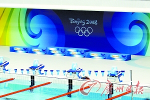 還有10天,2008年北京奧運(yùn)會(huì)即將開幕,如今每個(gè)人、每個(gè)場館都進(jìn)入了最后的備戰(zhàn)狀態(tài),尤其是比賽場館基本都處于封閉狀態(tài)。今天,借著難得的中、日花樣游泳公開訓(xùn)練機(jī)會(huì)記者有幸再次走進(jìn)國家游泳館——“水立方”。由于中、日兩隊(duì)臨時(shí)改變訓(xùn)練場,這倒讓記者得以好好領(lǐng)略了一下現(xiàn)在的“水立方”內(nèi)部。跳水臺(tái)后面黃色的“祥云”背景、游泳池旁的領(lǐng)獎(jiǎng)臺(tái)以及幾個(gè)巨大的觀賽顯示屏,加上記者席上的液晶顯示器,記者發(fā)現(xiàn),與年初的國際泳聯(lián)跳水世界杯時(shí)相比,這里變了很多。“現(xiàn)在我們真正可以說隨時(shí)等著比賽了!薄八⒎健钡目磁_(tái)席主管程秀麗信心十足地表示。