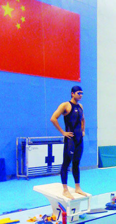 圖為中國(guó)隊(duì)員吳鵬體驗(yàn)“鯊魚皮”的神奇