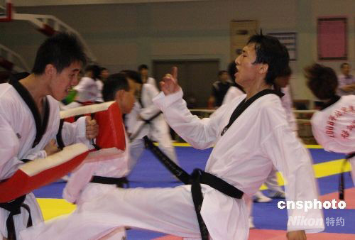 七月三十日,中華臺(tái)北隊(duì)跆拳道金牌選手朱木炎在高雄左營(yíng)選手訓(xùn)練中心訓(xùn)練,備戰(zhàn)北京奧運(yùn)會(huì)。 中新社發(fā) 曾嘉 攝