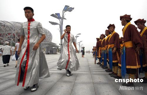 7月30日,第29屆夏季奧運(yùn)會開幕式在北京國家體育場“鳥巢”進(jìn)行封閉式彩排。圖為參演人員在場外等候入場。 中新社發(fā) 杜洋 攝