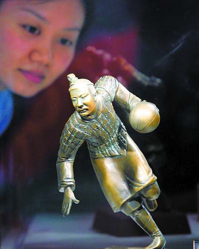 古老的兵馬俑練起了體操,踢起了足球。奧運(yùn)臨近,北京商家競(jìng)相開發(fā)各類具有中國特色的禮品,迎接各國來賓。限量100套的兵馬俑青銅運(yùn)動(dòng)雕塑在燕莎商城亮相,這是由一位年輕的雕塑師專門為奧運(yùn)“創(chuàng)意”的新作。 (記者 竇紅梅 戴冰攝)