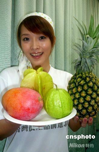 獲選奧運(yùn)推薦水果的臺灣鳳梨(菠蘿)、楊桃、芭樂(番石榴)、芒果共計10噸,正由島內(nèi)陸續(xù)運(yùn)往北京專供奧運(yùn)村。圖為記者會上,女主持人托著被形容為F4的這四種水果供記者拍照。中新社發(fā) 董會峰 攝