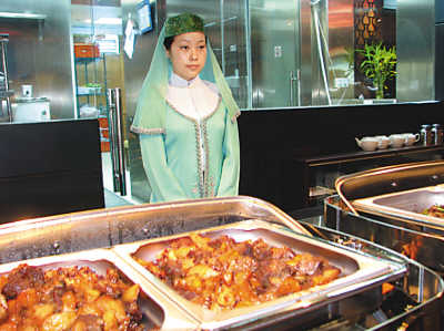 納賽爾剛剛走進(jìn)又一順飯莊,目光就被身著淡綠色伊斯蘭裝的服務(wù)員所吸引!八齻兊囊路秲浩!睘橘e客遞送餐具的時(shí)候,服務(wù)員楊晴的臉上一直掛著甜甜的微笑!拔覀兌Y拜帽上的紗巾,在阿拉伯國(guó)家是婦女蒙面用的,這樣的設(shè)計(jì)更加貼近了他們的風(fēng)俗!