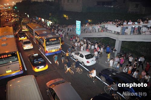 7月30日晚,北京奧運(yùn)開幕式帶妝彩排,前來“鳥巢”觀看的外圍民眾陡增,位于“鳥巢”周邊的北四環(huán)車流人流增大。 中新社發(fā) 陳文 攝