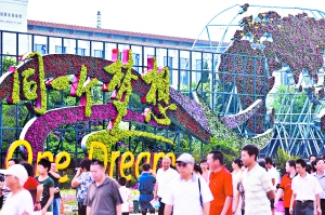 西側花壇的主題為“改革開放共譜和諧篇章”;▔倍螢椴屎玳T與中國結的組合造型,從花山上流下一條五彩的花溪,花溪鑲嵌有象征56個民族的56朵花和為廣大群眾熟悉的心手相連圖案,寓意全國人民萬眾一心、眾志成城、同心同德、團結奮斗建設社會主義和諧社會。同時也寓意心手相連、抗震救災的決心。南段花壇通過杭州灣大橋、嫦娥奔月工程、北京新地標性建筑和農業(yè)豐收景象,體現(xiàn)我國改革開放30年來取得的巨大成就。