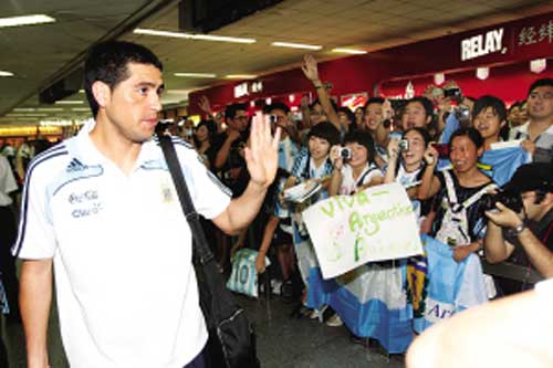 12時15分,阿根廷足球隊稍事休息后,魚貫步出候機大廳,早已等候在此的上海球迷立即歡呼起來,他們有的舉著寫有運動員名字的牌子,有的高喊運動員的名字。里克爾梅等球星,也熱情地向球迷們揮手致意。